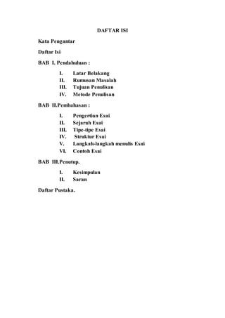 Esai adalah karangan karya tulis ilmiah pendek mengenai cara pandang seseorang dalam menyikapi suatu rumusan masalah dengan didasari pada landasan teori latar belakang dan cara pendangnya menyikapi hasil tulisan yang akan dibuat. Contoh tinjauan pustaka ini hanya sebgian saja. Rumusan masalah ini nantinya digunakan untuk dapat menyimpulkan hasil analisis dari paper yang.